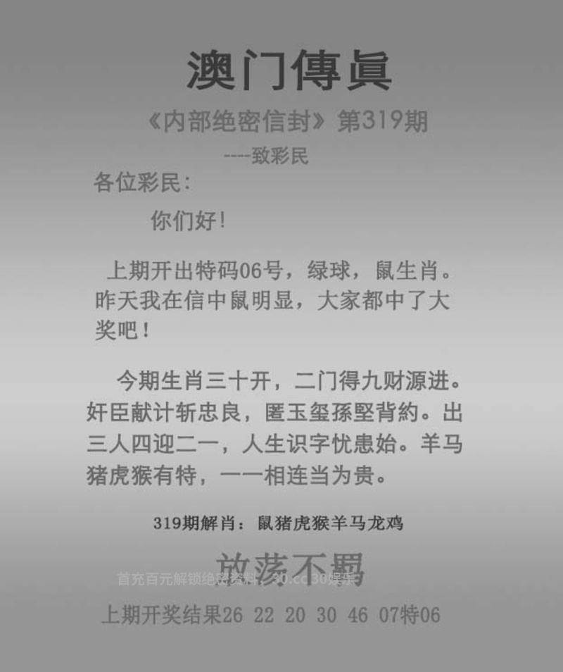 323期:澳门传真: 今期生肖一三开,三五飞絮沾衣裳。 小往大来退二门,八是吧额外过热。 合单小数玄机到,悠游活跃如穿梭。 看七合六一三连,躲在角落不见人。 倾吐衷肠 今期生肖一三开,解单肖兔牛猪鸡羊蛇,合单小数玄机到,解鼠兔龙蛇猴鸡。 综合:牛蛇龙鼠羊猴狗马猪 主特:17.29.13.25.14.26.18.30.23.35.22.34 |