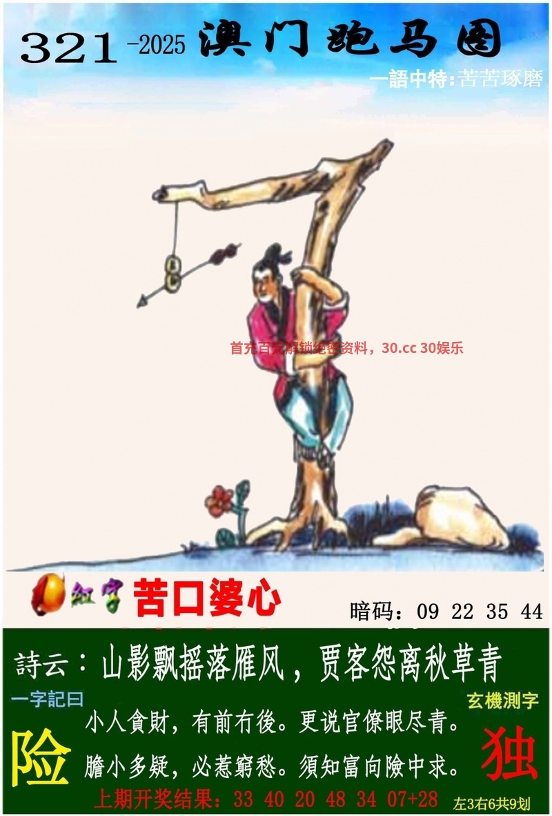 321期:一字記曰:【险】 小人贪财,有前冇后,更说官僚眼尽青。胆小多疑,必惹穷愁,须知富向险中求。《独》 解:山影飘摇落雁风:山影飘摇解羊鸡猴猪鼠兔虎。 生肖:羊鸡猴猪鼠兔 12码:23.47.09.21.10.22.19.31.18.30.27.39 |